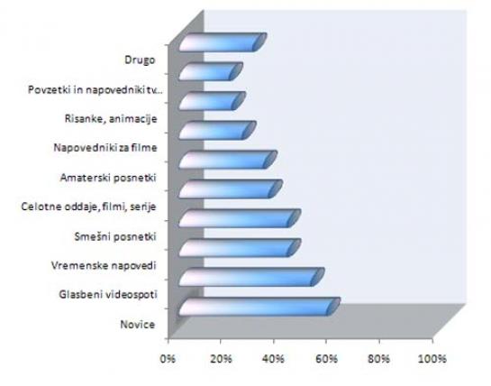 Med video gledalci je najbolj priljubljen portal za spremljanje tovrstnih vsebin YouTube (87 odstotkov), 26 odstotkov video vsebine spremlja prek Google videa, na tretjem mestu pa je s 24 odstotki največji domači video portal, Mojvideo.com.