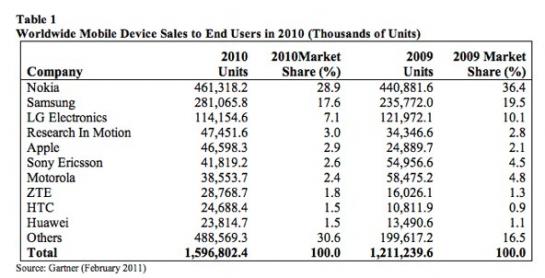 Podatki, ki jih razkriva raziskava kažejo, da je največjim proizvajalcem mobilnih telefonov tržni delež precej padel. Sicer je vrstni red po količini prodanih naprav še vedno enak kot leta 2009, kjer je vodila Nokia, sledila pa sta ji Samsung in LG, vendar je Nokiin delež iz dobrih 36 padel na slabih 29 odstotkov, Samsungov iz 19,5 na 17,6 odstotkov, LG-jev pa iz 10,1 na 7,1. Enako se je globalno zgodilo tudi Sony Ericssonu, ki mu je tržni delež padel iz 4,5 na le 2,6 odstotka, podobno pa kaže tudi Motoroli. Pravzaprav se je z rastjo lahko pohvalilo le malo podjetij, pa še ta ne z ravno pretresljivo dobrimi rezultati. Research In Motion (BlackBerrry) je tržni delež povečal iz 2,8 na 3 odstotke, toliko opevani Apple iz 2,1 na 2,9, HTC pa iz 0,9 na 1,5 odstotka.