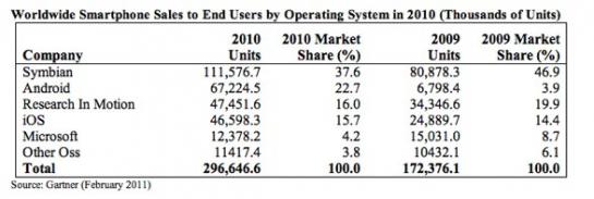Kljub temu, da se zadnje čase govori skoraj izključno o Androidu in iOSu, pa prvo mesto z naskokom drži Symbian. V letu 2010 je bilo prodanih več kot 111 milijonov aparatov z njim. Sicer je res, da se mu je tržni delež zmanjšal za skoraj deset odstotkov (iz 46,9 % na 37,6 %), a so številke še vedno dokaj močne. Največji skok pa je v letu 2010 doživel Android. Ta je iz skorajda anonimnega sistema, ki je predstavljal slabe štiri odstotke trga, v zadnjem letu zrase za skoraj desetkrat. Število prodanih naprav, ki jih poganja, se je iz slabih 6,8 milijona povzpelo na preko 67 milijonov, s čemer je Android za več kor 20 milijonov naprav prehitel tako Apple kot RIM in tako njegov tržni delež znaša kar 22,7 odstotka. Apple, ki se ga kot nasprotnika Androida največkrat omenja, se sicer tudi lahko pohvali s povečanjem prodaje, ki se je v letu 2010 skoraj podvojila, vendar je skok iz 14,4 na 15,7 odstotkov trga kar nekako zasenčena spričo Androidovih rezultatov. Če so pri Googlu oziroma podjetjih, ki na svoje naprave nameščajo Android, lahko zelo veseli, pri Applu pa zadovoljni, pa RIM-u in Microsoftu ni ravno do smeha. Research In Motion je sicer leta 2010 prodal dobrih 13 milijonov naprav več kot leto prej, vendar je spričo boljših rezultatov konkurence njegov tržni delež vseeno padel in sedaj znaša le 16 odstotkov. Še huje pa je pri Microsoftu. Temu se je prodaja tudi količinsko zmanjšala, saj so leta 2009 prodali nekaj več kot 15, leta 2010 pa le nekaj več kot 12 milijonov naprav, s čemer jim je tržni delež padel iz 8,7 na 4,2 odstotka, vendar je treba vedeti, da leta 2009 in dobršen del 2010 še niso imeli Windows Phone 7. Ali lahko Microsoftu uspe to, kar je Androidu? Slednji je dokazal, da je v kratkem času mogoče narediti marsikaj. Toda ali je tega sposoben tudi Microsoft? Je Windows Phone 7 res adut, na katerega je mogoče staviti?
