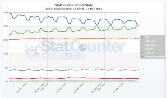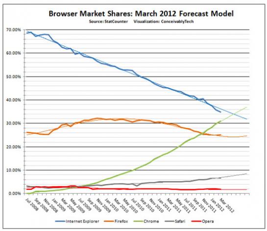 Najnovejši podatki kažejo na to, da je tržni delež Chroma 32,7 %, Internet Explorerja 32,48 %, Firefox pa se drži pri 24,88 %. Razlika med prvima dvema je sicer izredno majhna, vendar trendi kažejo na to, da se bo povečala. Še ta mesec naj bi Chrome pridobil odstotek, Internet Explorer pa slab odstotek izgubil kar kaže na nadaljevanje skoraj štiriletnega trenda linearnega padanja deleža Internet Explorerja. Sredi leta 2008, ko je izšel Chrome, je bil ta še okoli 70 %, sredi leta 2009, ko se je Chrome začel uveljavljati in rasti, že okoli 60 %, nato pa je vsako leto izgubljal po okoli deset odstotkov. Chrome je v tem času skoraj enak odstotek pridobival. Firefox je v tem času več ali manj miroval oziroma je iz okoli 25-odstotnega deleža leta 2008 zrasel na okoli 32 % konec leta 2009, nato pa začel spet počasi padati, tako da je sedaj na približno enaki ravni kot je bil leta 2008.