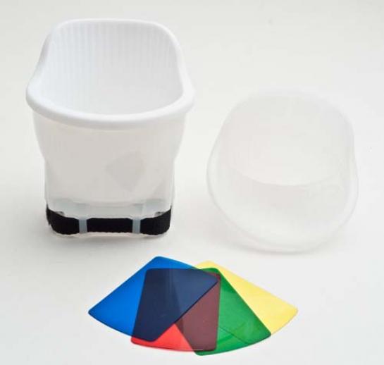 Male bliskavice postajajo čedalje pomembnejši dodatek, kar s pridom izkoriščajo proizvajalci dodatkov za njih. Tokrat so na vrsti mehčalci svetlobe, trije na klasičen način in en posebnež. Pod imenom Aurora Lite Bank se skrivajo trije mehčalci oziroma »softboxi«, ki jih dobite v kompletu. Eden je okrogle oblike, ostala dva sta klasične pravokotne. Največji meri 17,5 x 13,5 cm, najmanjši je okrogli s premerom 12 cm. Na bliskavico se pritrdijo z ježki, trak je priložen. Velikost ustreza praktično vsem izmenljivim bliskavicam in jih dokaj hitro pritrdimo. Ker so svetlobna okna iz blaga, jih lahko tudi dobro zložimo in nam v torbi zavzamejo zelo malo prostora. Notranja stran je posrebrena in tako dodatno odbojna, saj tako večino svetlobe usmeri proti svetlobnemu oknu. V praksi so se dobro izkazale, bistvene razlike med njimi in podobnim Lumiquestovim svetlobnim oknom ni. Magic Diffuser je iz drugačnega testa, namreč gre za nastavek, ki je na prvi pogled podoben plastičnemu kozarcu s posebnim pokrovom. Za razliko od drugih podobnih izdelkov ima boljši način pritrjevanja, s paščkom, ki je razširljiv in s tem primeren za veliko večino izmenljivih bliskavic. Pokrova za usmerjanje svetloba sta dva, eden je namenjen svetlejšim in nižjim stropom, drugi višjim oziroma temnejšim. Poleg so tudi štirje barvni geli za razne barvne efekte. Tudi ta nastavek se v praksi dobro obnese, sence so mehkejše, a po drugi plati mora bliskavica dati od sebe več moči.
