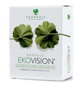 Kapsule Ekovision so najbogatejša kombinacija luteina, zeaksantina, betakarotena ter ostalih antioksidantov, ki z intenzivnim zaščitnim delovanjem na vaše oči delujejo kot sončna očala. Ekovision vsebuje še vitamin A, vitamine iz skupine B, vitamina C in E, taurin ter pomembne minerale, kot so cink, selen, baker in železo, ki prav tako pomembno vplivajo na ohranitev zdravja oči.