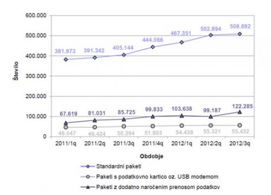 V zadnjem obdobju je opaziti zvečanje števila uporabnikov mobilnega širokopasovnega dostopa do interneta standardnih paketov, paketov s podatkovno kartico oz. USB modemom in paketov z dodatno naročenim prenosom podatkov. Konec tretjega četrtletja je bilo 508.692 uporabnikov mobilnega širokopasovnega dostopa do interneta standardnih paketov. Njihovo število se je v primerjavi z minulim obdobjem zvečalo za 1,2%. V opazovanem obdobju je bilo 55.432 uporabnikov, ki so se odločili za pakete s podatkovno kartico oz. USB modemom, kar je za 0,2% več glede na drugo četrtletje 2012. Konec tretjega četrtletja pa je mogoče opaziti tudi povečanje števila uporabnikov paketov z dodatno naročenim prenosom podatkov na 122.285. Število teh uporabnikov je v primerjavi s predhodnim četrtletjem večje za 23,3%. Zvišanje števila uporabnikov mobilnega širokopasovnega dostopa do interneta lahko pripišemo vedno večji uporabi pametnih telefonov in pestri ponudbi vsebin.