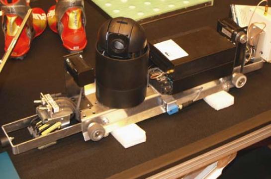 Najuporabnejše so preproste rešitve. Ali je ta tudi taka, presodite sami. Podjetje Roboti je razvilo robota za video nadzor, ki je v bistvu nadzorna kamera, nameščena na voziček. Ta se premika po tračnicah, nameščenih pod stropom, dolžine do 200 metrov. Po vsej dolžini tračnice je nameščen reflekcijski filter, ki omogoča kameri, da »vidi« skozi, opazovalcu pa preprečuje, da bi videl, kje je robot. Ena kamera tako pokrije večji prostor, manj pa je tudi mrtvih kotov.