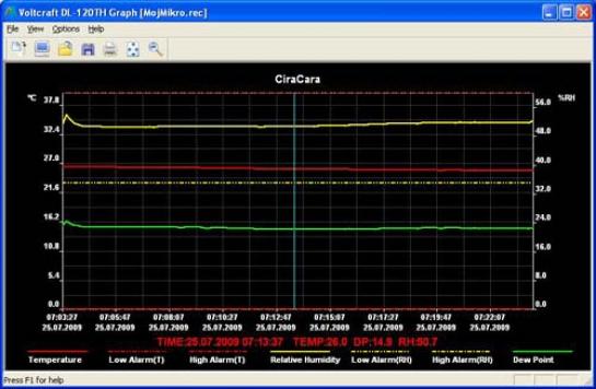 Podatke si lahko ogledamo v obliki grafa ali pa jih izvozimo v tabelo xls. Zaradi majhne porabe energije je življenjska doba baterije ob 5-sekundnem intervalu po proizvajalčevih podatkih okoli enega leta. Če interval podaljšamo na 10 sekund, pa se obratovalni čas podaljša na 2,5 leta. Uporabnost naprave je v temperaturnem območju od – 40 °C do +70 °C z odstopanjem ±1 °C v območju od 0 °C do 40 °C ter ±2,5 °C v preostalem območju. Območje merjenja relativne zračne vlažnosti je od 0 do100 % RH. Z natančnostjo ±2 % RH pri 25 °C in 40 % do100 % RH. Možnost nastavitev intervalov merjenja 2, 5, 10 in 30 sekund, 1, 5, 10 in 30 minut ter 1, 2, 3, 6, 12 in 24 ur. Naprava s svojimi 130 x 30 x 25mm in 20 g najde prostor v vsakem žepu in tako omogoča nemoten transport. Ker je energijsko neodvisna, jo lahko uporabimo tudi na območjih brez električne energije. Če potrebujete samo merilnik temperature, se lahko namesto za nakup modela DL-120TH odločite za DL-100T, ki bo vašo denarnico stal približno 20 evrov manj kot »vlažni« brat. Obe napravi imata tudi LED-diodi za prikaz delovanja – delovanje in alarm. Glede na dobljene podatke v času kurilne sezone se bom tako lažje odločil za glavni vir ogrevanja stanovanjske hiše. Priročna naprava pa bo koristna tudi pri spremljanju temperature na podstrešju, kjer bodo zunanje enote klimatov. Področja uporabe naprave so seveda praktično omejena z vašimi potrebami in iznajdljivostjo. Brani se je niti oče (sicer podobnih igračk ne mara), ljubiteljski vinogradnik, ki z napravo spremlja tako temperaturo kot vlažnost kleti
