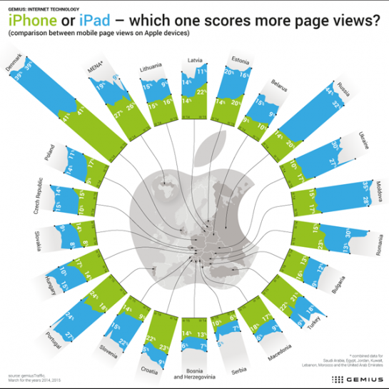 Podatki za Slovenijo pokažejo, da je marca 2014 do spletnih strani z mobilnika iPhone prihajalo 9 odstotkov prometa, marca 2015 pa je delež znašal že 14 odstotkov. Nasprotno pa je delež obiska s tablice iPad upadal, z 22 odstotkov leta 2014 je padel na 15 odstotkov v letu 2015.