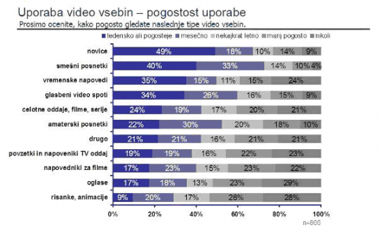 Med uporabniki video vsebin so najbolj priljubljene video vsebine na spletu novice, kar 49 odstotkov uporabnikov pravi, da jih gleda tedensko ali še pogosteje. Sledijo smešni posnetki s 40 odstotki rednih gledalcev, vremenske napovedi s 35 odstotki, glasbeni videospoti s 34 odstotki in oddaje, filmi oziroma serije s 24 odstotki rednih gledalcev. Na ravni mesečnih obiskov pa je delež smešnic sorazmerno višji kot delež ostalih vsebin, saj si smešne video posnetke mesečno ogleduje kar 73% uporabnikov video vsebin. Zanimiv je tudi podatek, da video oglase tedensko gleda kar 17 odstotkov uporabnikov video vsebin na spletu, najmanj priljubljene pa so risanke in animacije.