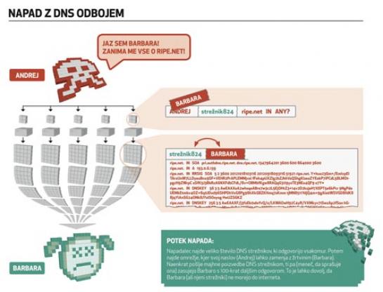 Na začetku smo zapisali, da se napad lahko imenuje tudi “DNS amplification” - napadalec pošlje majhno vprašanje in doseže, da se proti žrtvi usmeri veliko daljši odgovor. Primer: poizvedba ripe.net IN ANY? je dolga 26 bytov in je včasih dala odgovor, ki je bil dolg 250 bytov. Napadalec je lahko včasih računal torej s faktorjem ojačanja 10. Zaradi DNSSEC podatkov v odgovoru pa je danes odgovor na isto poizvedbo dolg kar 2630 bytov, faktor ojačanja je torej kar 100!