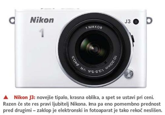 Smo vas z opisom Nikona V2 prestrašili? Vdihnite, izdihnite, naslednja zgodba je drugačna. Resnično drugačna, čeprav prihaja iz iste družine. Pravzaprav je tako drugačna, da se sprašujemo, ali je novinec res Nikonov? Čiste linije, zaobljeni robovi, minimalizem pri gumbih, a kljub temu polno funkcionalen fotoaparat z vsemi pomembnimi možnostmi. Res je treba nekatere iskati v menijih, a tiste pomembne so na voljo takoj. Podobno kot pri prejšnjih modelih je tudi tu treba izbrskati pomembnejše fotografske načine, medtem ko so tisti, namenjeni začetnikom, hitro dosegljivi. Za resnejše uporabnike narobe svet, tukaj imajo snovalci prav, začetniki se morajo hitro znajti, tisti, ki znajo, si lažje vzamejo čas. J3 ima enako tipalo kot V2, kar ga postavlja ob bok V2 in pri visoki občutljivosti pod trenutno aktualne brezzrcalne tekmece. Prekaša ga celo Sonyjev RX100, ki ima večje število pik in dinamičen obseg. Odkupi se s hitrim ostrenjem, ki je na isti ravni kot V2. Tudi cena novinca je postavljena nad konkurenco, kar spet sproži podobno vprašanje, kot smo si ga že zastavili pri V2. Glede na to, da imajo brezzrcalni fotoaparati krepko manj mehanskih delov, bi morala biti izdelava cenejša kot za zrcalnorefleksne modele. Slednje dokazuje Sony z zgoraj opisanim A3000, o čem natančno razmišljajo Nikonovi vodilni, pa lahko le ugibamo.