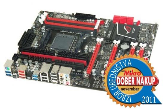 Platforma AMD 990FX je sicer na trgu že nekaj časa in skupaj z južnim mostom SB950 tvori platformo za procesorje, združljive z vmesnikom AM3+. Sama platforma je nekaj že videnega, v ASUS-ovi izvedbi Crossfire V Formula pa nekaj povsem novega. Ploščo smo preizkusili z novim AMD-jevim osemjedrnim namiznim procesorjem z jedrom Bulldozer (Zambezi), uradno poimenovanim FX-8150. A več o tem v sosednjem članku – povzetek: procesor je na plošči deloval brezhibno! Plošča je posebnež ne le zaradi črno-rdečega videza tiskanine in elementov, temveč tudi zaradi tega, ker kot ena prvih uporablja grafični nadomestek BIOS-a, UEFI. Nastavljanje BIOS-a je sicer dokaj podobno kot prej, le da je vse v grafiki, da lahko uporabljamo miško in da lahko nastavitve (pozor!) celo natisnemo. Seveda na plošči delujejo tudi vsi starejši AMD-jevi procesorji za platformo AM3. Plošča v navezi z novim veznim naborom prinaša kar šest vrat USB 3.0 ter sama Gb/s vrata SATA III 6. Število linij PCIE ostaja podobno predhodnici, na 890FX temelječi Crossfire IV, vezni nabor jih namreč podpira kar 42, in tako omogoča vrsto kombinacij rež PCIE x16/x8, kar odpira vrata za različne (prihodnje) kombinacije vzporednega grafičnega procesiranja. Plošča uradno podpira vse vzporedne grafične kombinacije do trojnega CrossfireX in 3Way-SLI. Osnove so na tej plošči urejene, kot se šika: 8+2-fazno napajanje, podpora procesorjev s porabo do 140 W, vgrajene navijalske funkcije... Za zvok skrbi Creativov X-Fi, ki ponuja prostorski zvok EAX Advanced HD 5.0, ima pa tudi certifikat THX TruStudio PRO. Vsi čipi na plošči so hlajeni pasivno. Med zanimivimi dodatki najdemo na matično ploščo nameščena gumb za praznjenje BIOS-a ter gumb TurboKey II. Zraven je še ROG Connect – na USB temelječa reža, s katero ASUS naslavlja potrebe sodobnih igričarjev in navijalcev, saj omogoča avtomatsko navijanje sistema ter prek ROG Connecta spremljanje dogajanja iz drugega na USB priključenega računalnika (recimo iz prenosnega računalnika − priložena je vsa potrebna programska oprema). Tu ostaja ROG Core Unlocker, ki odklene izklopljena jedra okrnjenih procesorjev (a ne na Barceloni). Vgrajeni so priključki za priklop voltmetra, zanimiva pa je tudi zaščita proti pregrevanju, ki pokriva vse kritične elemente (komponente) na matični plošči in preprečuje trajno škodo. Plošča je raj za navijalce, a tudi popolni začetniki bodo dobili dodatno vrednost, saj je na matični plošči poleg gumbov za vklop in reset še gumb O.C., ki samodejno navije platformo na optimalne vrednosti! Plošča je tudi s starejšimi procesorji dosegla višje frekvence kot na referenčni Gigabytovi plošči 890FX. Čeprav vezni nabor 990FX prinaša manjši preskok, kot smo ga vajeni iz preteklosti, pa je ASUS odlično izvedel vse in ploščo uravnotežil, poleg tega pa je skoraj dvakrat cenejša kot stara različica, tako da pomeni odličen nakup.