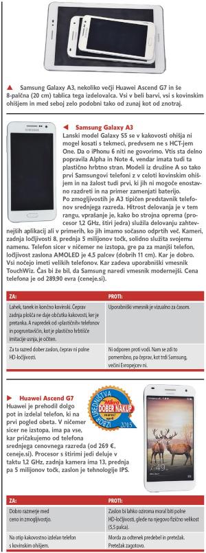 Pa smo spet pri Samsungu, ki se je odločil za novo imenovanje svojih telefonov. Družina najcenejših pametnih telefonov ima oznako Galaxy J, srednjekategorniki pa A z dodano številko, ki označuje velikost zaslona. Krajši čas smo imeli možnost poskusiti telefon A3. Zaslon je velikosti 4,5 palca (11,5 cm), ohišje pa je v celoti kovinsko. Tudi hrbtna stran, ki je pri modelu Alpha še plastična. Občutek držanja telefona, ki je tudi dokaj tanek, je mnogo boljši kot pri do zdaj plastičnih Samsungovih telefonih, moramo pa omeniti, da nam izstopajoč objektiv ni všeč in nas moti. Nekaj milimetrov debelejše ohišje ne bi nikogar motilo, bi bil pa zato prostor za večjo baterijo. Sicer pa je tudi trenutna dovolj vzdržljiva. Je pa ta telefon nekoliko dražji od omenjenega G7, kljub manjšemu zaslonu. Model Galaxy A7, ki ima enako velik zaslon, pa je še dražji.