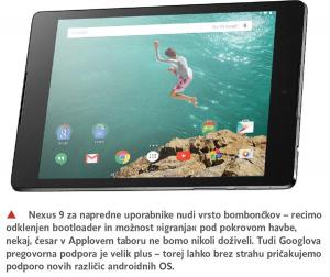 ZA: Strojno gledano je Nexus 9 zelo zmogljiva tablica, saj v praktično vseh merilih predstavlja izboljšavo glede na predhodnike in tudi glede na konkurenco. Prvič – razmerje stranic 8,9-palčnega zaslona je 4 : 3, pa tudi sama ločljivost je z 2048 x 1536 točkami enaka iPad Airu 2, kar pomeni, da je uporabnost tablice za deskanje po spletu in tudi za vsa ostala opravila precej izboljšana. Tradicionalno so imele androidne tablice razmerje stranic 16 : 10 ali 16 : 9 in bile bolj primerne za gledanje filmov. Drugič – zvočnika sta na prednji strani zaslona, kar usmerja zvok neposredno proti uporabniku. Izvedba nas je sicer pustila ravnodušne, HTC BoomSound nudi dober zvok in tudi jakost je nad našimi pričakovanji, a hkrati sta zvočnika na sredini krajših stranic, namesto pričakovano in bolj logično na sredini daljših stranic. Tako pa ju velikokrat pokrijemo s prijemom. Tretjič – močan dvojedrni 64-bitni Nvidia Tegra K1 procesor s taktom 2,3 GHz in s kar 2 GB vgrajenega pomnilnika. Četrtič – Nexus 9 obvlada praktično vse povezljivostne tehnologije, tako NFC, Bluetooth 4.1 z A2DP in aptX kot Wi-Fi 802.11ac. In petič – najnovejši Android 5 Lollipop.