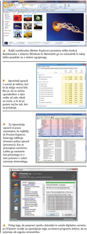 Upravitelj opravil osmice je najzmogljivejši, kadar koli vključeni v operacijske sisteme Windows. Poln je funkcij in izboljšav, kot so na primer možnost obnovitve datoteke »explorer.exe« z enim klikom, močno izboljšanim zavihkom za spremljanje »zmogljivosti« sistema in novim orodjem za upravljanje z zagonskimi programi. Microsoft bi lahko že davno v sistem vključil takšnega upravitelja, pa ni, na žalost pa tudi ni programa za sedmico, ki bi v celoti posnemal zmogljivosti upravitelja osmice. Še najbližje je Process Explorer (tinyurl.com/nd6fuwt). Sicer dokaj zapleten program, ki pa je v nekaterih primerih enostavnejši za uporabo od v sistem vgrajenega upravitelja. Procese sistema prikazuje v drevesnem pogledu, da lahko razumemo, v kakšni povezavi so si med seboj. Kateri proces na primer zažene še »n« drugih procesov, ki trenutno tečejo na računalniku. Če vam je program všeč, ga lahko nastavite (znotraj menija »option«), da postane privzet, kar pomeni, da v celoti zamenja Microsoftovega upravitelja.