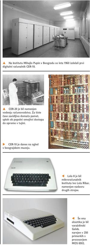 V bivši Jugoslaviji je konec leta 1962 delovalo 30 elektronskih računalnikov, leta 1966 jih je bilo 56 in leta 1968 že 95. Prvi jugoslovanski računalniški strokovnjaki so se šolali v evropskih računalniških centrih (Pariz leta 1954 in 1955, Darmstadt leta 1959, Dunaj leta 1960, Cambridge leta 1961 in London leta 1964). Inženirji, ki so s šolanj v tujini prinesli znanje, so pod vodstvom dr. Tihomirja Aleksića na Institutu Mihajlo Pupin v Beogradu konec petdesetih let zasnovali prvi domači digitalni računalnik.