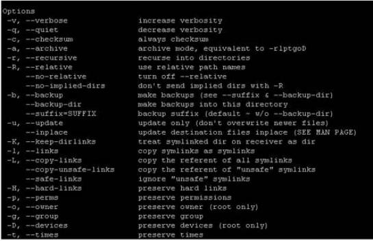 • Učinkovitost rsynca se skriva v tem, da počne tisto, kar potrebujemo. Prek omrežja se pošiljajo le deli datotek, v katerih so spremembe, ki se dodatno stiskajo. Z uporabo protokola SSH lahko zagotovimo tudi ustrezno zasebnost prenosa. Uporabimo ga lahko za zrcaljenje diskov ali varnostno kopiranje. Podprta je tudi uporaba ohranjanja pravic oziroma lastništva nad datotekami. Seznam možnih parametrov najdemo na strani http://ss64.com/bash/rsync_options.html.