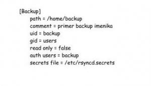 Ta datoteka je konfiguracijska datoteka za rsync, ko ta deluje z možnostjo »daemon«. V tem primeru postane rsync strežnik, ki »posluša« na TCP-vratih 873 in čaka povezavo odjemalcev rsync. V datoteko rsyncd.conf vpišemo:
