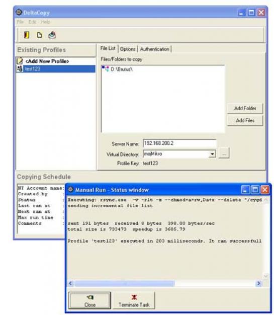 Zdaj že znamo prenašati podatke med Linux/Windows odjemalci in strežnikom. Množica parametrov rsynca omogoča veliko kombinacij, s katerimi je mogoče zagotoviti želene funkcionalnosti. Dejstvo pa je, da uporaba rsynca ni ravno zgled običajnemu uporabniku prijazne aplikacije. Res je, da lahko pripravimo tipe datotek in jih pozneje le še preurejamo. Komur to ni ravno po godu, lahko uporabi program DeltaCopy (www.aboutmyip.com/AboutMyXApp/DeltaCopy.jsp). Gre za brezplačen program, namenjen uporabi v okolju Windows od vključno različice 2000 dalje. DeltaCopy je zgrajen na temeljih rsynca, dopolnjen pa je z grafičnim vmesnikom in nekaterimi dodatnimi funkcionalnostmi. Podpira praktično vse, kar smo spoznali do zdaj (npr. prirastno varnostno kopiranje), dopolnjen pa je tudi z drugimi možnostmi.