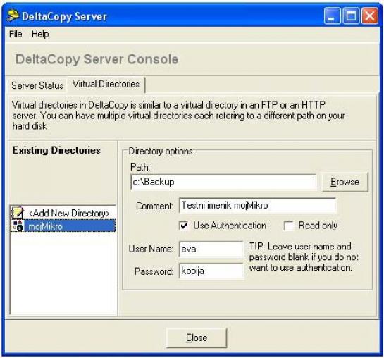 V celotnem paketu sta tako strežnik kot odjemalec. Strežnik aktiviramo iz konzole Delta Setup (Dsetup.exe). Storitev registriramo s klikom gumba Register Windows Service. Za registracijo potrebujemo ustrezne uporabniške pravice, ki nam omogočajo zagon strežnika (strežnik je viden tudi prek pregleda storitev na Nadzorni plošči). Nato v zavihku Virtual Directories, ki imajo podobno vlogo kot pri strežnikih FTP/http, ustvarimo navidezni imenik (Add Nes Directory) in vnesemo ime (npr. mojMikro). Izberemo ta imenik in v polju Directory options pokažemo polje Path ter imenik, v katerega želimo shranjevati kopije (npr. C:\Backup). V polje Comment vnesemo komentar (npr. Testni imenik mojMikro), aktiviramo možnost Use Authentication ter vnesemo uporabniško ime in geslo (npr. eva za uporabniško ime oziroma kopija za geslo).