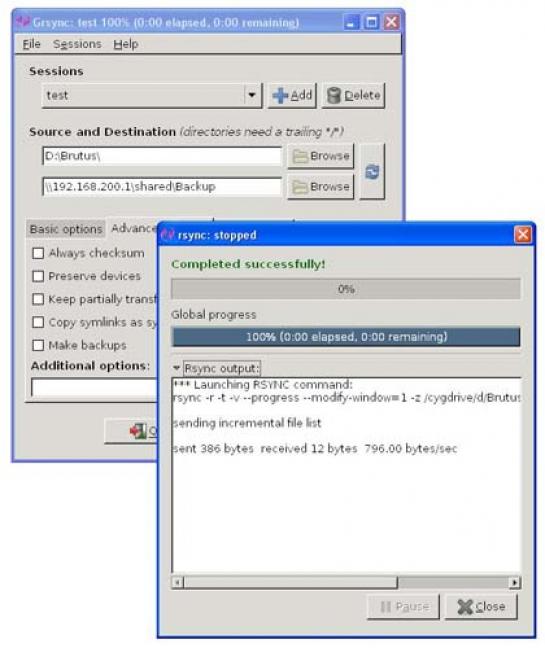 Natančnejše informacije o možnih parametrih lahko dobimo z ukazom rsync –-help oziroma rsync –-daemon –-help. Rsync lahko uporabimo tudi v računalniških sistemih, kjer imamo nameščeno eno od različic Windows. Kot v podobnih primerih je tudi tukaj uporabljen program Cygwin (www.cygwin.com/), že pripravljeno različico rsynca za okolje Windows pa lahko prenesemo s spletnega naslova http://sourceforge.net/projects/backuppc/files/cygwin-rsyncd/. Arhivsko datoteko prenesemo iz spleta, odpremo v imeniku c:\rsync in že lahko uporabljamo rsync. Datoteka rsync.exe je »ekvivalent« originalnemu paketu rsync. V datoteki rsyncd.conf zapišemo potrebne konfiguracijske parametre v primeru, ko rsync zaganjamo kot storitev. Datoteko rsyncd.secrets uporabimo za potrebe avtentikacije odjemalcev rsync. Podatki o uporabniških imenih in geslih so zapisane v obliki prosto berljivega besedila. Pri prenosu preko omrežja se ti ustrezno šifrirajo. Datoteka cygrunsrv.exe omogoča delovanje programa Cygwin kot storitev, cygwin1.dll pa je potrebna za delovanje obeh izvršljivih (exe) datotek. Če imate Cygwin že nameščen, teh datotek ne nameščamo. Paketna datoteka servece.bat olajša delo, povezano z namestitvijo rsynca kot storitve oziroma nastavitvijo požarnega zidu Windows XP (odstranitev rem pred vrsticami v paketni datoteki). Izvršljive datoteke zaganjamo iz ukazne vrstice (Start-cmd oziroma Command Prompt).