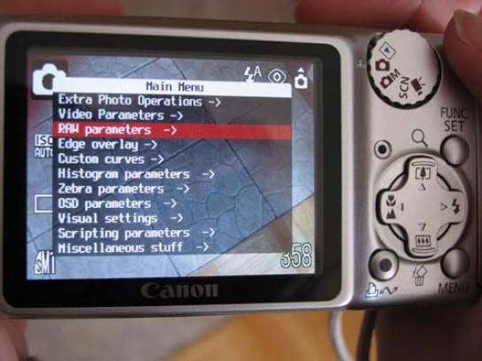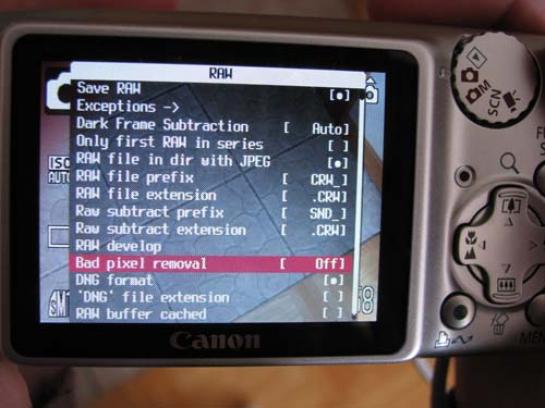Nastavimo še možnost zapisa RAW (RAW Parameters). Z vidika uporabe programske opreme je primeren neposreden zapis v datoteko DNG (Digital Negative). Tako se bomo izognili različnim neprijetnostim, ki so povezane z napačnimi barvnimi nivoji, ki smo jim bili priča v preteklosti pri pretvorbi datotek za določene tipe fotoaparatov. Za zapis v DNG žal ne bo zadoščala le izbira v meniju. Če želimo uporabljati zapis v datoteko DNG, mora biti na kartici SD prisotna datoteka badpixel.bin. V njej so zapisani podatki o neuporabnih elementih senzorja (slikovnih pik). Do tovrstne datoteke lahko pridemo na dva načina. Prvi ni priporočljiv in ni vedno uspešen, saj aparatu podtaknemo prazno datoteko z ustreznim imenom. Druga možnost je, da s strani http://tools.assembla.com/chdk/browser/trunk/CHDK/SCRIPTS/TEST/badpixel.... prenesemo skriptno datoteko badpixel.lua in jo namestimo (prek bralnika kartic) v imeniku /CHDK/SCRIPTS/TEST. Ko poženemo ta skript, bo aparat samodejno naredil dva posnetka in izračunal potrebne podatke ter naredil potrebno datoteko badpixel.bin. Celotni postopek traja približno pol minute. Šele zdaj lahko v meniju »RAW parameters« izberemo možnost shranjevanja v datoteko DNG. Vsekakor koristna novost. Če želimo prenašati posnetke v zapisu DNG neposredno prek povezovalnega kabla USB, določimo še aktivnost parametra, ki omogoči shranjevanje datotek JPG in DNG v istem imeniku na kartici SD.