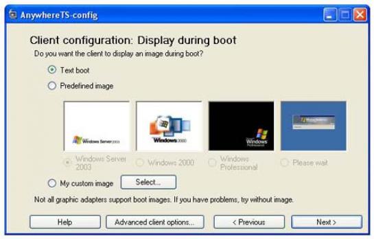 V našem primeru virtualizacijski strežnik oziroma navidezna delovna postaja ni v računalniku z nameščenim AnywhereTS, zato pod Terminal Server izberemo tretjo možnost in z gumbom Add dodamo IP-naslov želenega navideznega računalnika (npr. 192.168.200.202). Strežnika TFTP v tem primeru ne bomo uporabili, zato lahko vrednost za TFTP pustimo nespremenjeno. Ker imamo v omrežju že strežnik DHCP, pustimo nespremenjeno tudi to vrednost. Določimo še druge parametre in potrdimo vnos. Po shranitvi parametrov se nam odpre okno z dobrodošlico (Welcome to AnywhereTS). AnywhereTS bomo uporabili za pripravo zagonske slike CD-medija, saj želimo lahki odjemalec zagnati neposredno s CD-ja. Izberemo možnost Make client – Make client image. Ker želimo kar se da samodejno delovanje, izberemo možnost Unmanaged. Slabost tega načina je, da je treba v primeru spremembe parametrov (npr. ločljivost zaslona, jakost zvoka ...) znova generirati sliko zagonskega medija. Če nam to ni všeč, izberemo možnost Managed, a je treba narediti določene spremembe. Ker imamo brezplačno različico, izberemo v nadaljevanju možnost AnywhereTS client, ki je v primerjavi s plačljivo različico Pro omejena (npr. največja ločljivost zaslona, ni podpore za preusmeritev zaporednega oziroma USB-vmesnika ...). Sledi korak izbire protokola, ki bo v našem primeru zaradi uporabe oddaljene povezave na Windows XP kar Microsoft Terminal Server oziroma RDP. V polje Another server vnesemo IP-naslov navideznega računalnika (v našem primeru je to 192.168.200.202). Med omrežnimi nastavitvami lahko izberemo možnost Auto-detect, IP-naslov svojega lahkega odjemalca pa lahko določimo ročno ali prek strežnika DHCP (use DHCP). Samodejno nastavitev lahko izberemo tudi za zvočno kartico in grafiko. Glede na različico Windows ,do katere dostopamo, lahko določimo želeno ločljivost (npr. 1024 x 768, 24-bitna globina). V koraku, ki sledi, določimo želen videz prijavnega okna našega lahkega odjemalca. Izbiramo lahko med besedilnim načinom, pripravljenimi slikami ali pa uporabimo lastno sliko (npr. logotip podjetja, opozorilo glede nepooblaščene uporabe ...). Popolnoma na koncu izberemo še način zagona lahkega odjemalca V brezplačni različici sta podprta zagon prek omrežja in s CD-ja, komercialna podpira tudi druge načine (npr. USB-ključek). Izberemo izdelavo slike za CD in vnos potrdimo. Rezultat je približno 11 MB velika datoteka (*.iso), s katero lahko izdelamo zagonsko zgoščenko. Računalnik, ki ga želimo uporabiti v vlogi lahkega odjemalca, le še zaženemo s te zgoščenke (pogoj je ustrezna nastavitev zagona v BIOS-u). Pomembno pa je, da vsebina morebitnega trdega diska ostane nedotaknjena.
