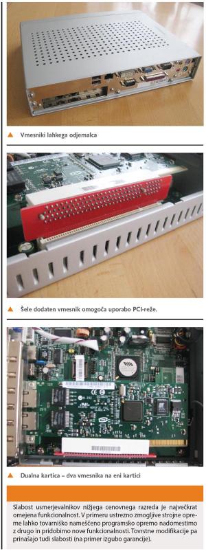 Tovarniško vgrajeni vmesnik 100BaseT smo predvideli za WAN-vmesnik (kar nam zadošča), saj imamo na glavni WAN-povezavi domačega omrežja simetrični dostop 10/10 Mb. PCI razširitveno režo smo zato lahko uporabili za vdelavo dualne Intelove kartice, namenjene strežnikom (model Intel 8492MT). Ta mrežna kartica ima zato na eni fizični kartici dva vmesnika 1000BaseT. To pomeni, da bo imel naš usmerjevalnik skupaj tri fizične vmesnike, od katerih bomo dva uporabili za WAN- oziroma LAN-priključek, tretjega pa bomo lahko uporabili po potrebi (pravi DMZ, drugi WAN-priključek, drugi LAN-priključek …). Na tem mestu opozorimo še na nekaj: Intelova kartica je namenjena uporabi v PCI-E razširitvenem vodilu, uporabimo pa jo lahko tudi v PCI-vodilu. V primeru takšne namestitve bo del vodila kartice »v zraku«, posledica pa so tudi slabše zmogljivosti, kar v našem primeru ne bo pomenilo večje težave.