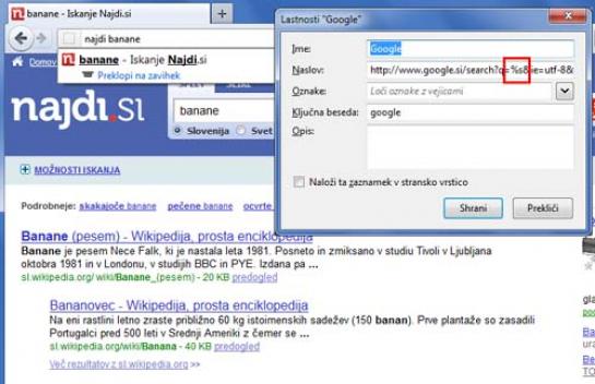 Kako to naredimo? Dokaj preprosto. Najprej sprožimo Googlovo iskanje katerega koli niza. Recimo spet »banane«. Ko dobimo rezultate, pritisnemo kombinacijo tipk Ctrl+D, da rezultate iskanja shranimo med zaznamke. Zdaj ta zaznamek na seznamu poiščemo, ga kliknemo z desno tipko in izberemo Lastnosti. Prikazalo se bo okence, v katerem bo nekaj vnosnih polj. V polju Ime bo najbrž pisalo »banane - Iskanje Google« Ta vnos zamenjamo tako, da napišemo samo Iskanje Google ali celo samo Google, s čimer damo zaznamku novo ime. Nato se preselimo v polje Naslov, kjer bo tisti čirule-čarule. Premaknemo se do dela, kjer piše »banane«, in besedo nadomestimo z %s. Nato se prestavimo v polje Ključne besede in vanj vpišemo »google« (brez narekovajev). Zdaj vse skupaj shranimo. Če zdaj pogledamo med zaznamke, vidimo, da je ustvarjeni zaznamek preimenovan v Google, torej v to, kar smo zapisali v polje Ime. Kako pa zadevo uporabimo? Preprosto. Vzemimo, da bi zdaj radi prek Googla spet našli strani, ki vsebujejo izraz banana. Ker smo izdelali bližnjico s ključno besedo google, lahko zdaj iskanje sprožimo tako, da v naslovno vrstico vpišemo: