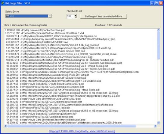 Kaj pa, če to še vedno ni dovolj. Kaj naj pa potem brišem? Načeloma lahko odstranite kak program, ki ga več ne uporabljate. Ali pa kakšno igrico. A še preden posežete po čem tako rigoroznem, predlagam še eno možnost. Ta je povezana s 390 KB dolgim programčkom, imenovanim List Large Files, ki ga lahko snamete s strani www.delphiforfun.org/Programs/Utilities/. Ta program dela točno to, kar pove že ime – prikaže velike datoteke. Deluje tako, da mu povemo, kateri disk naj pregleda in koliko datotek naj prikaže, sam pa nato pregleda disk in razvrsti datoteke od največje do najmanjše. Po seznamu se lahko sprehajamo in če kliknemo na kakšno datoteko, se odpre okno Raziskovalca, v njem pa mapa, kjer je datoteka , kar olajša brisanje.