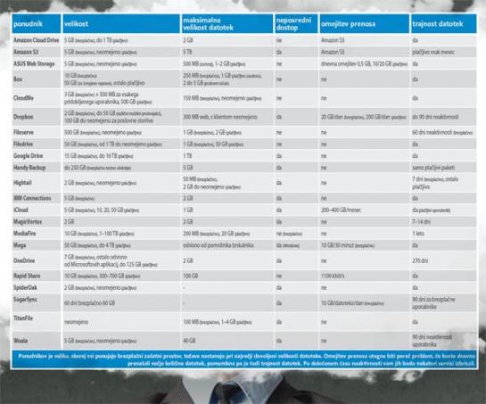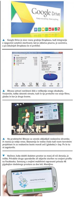 Eden bolj razširjenih je Dropbox, v osnovi s 5 GB ima uporabnega klienta, ki ždi v orodni vrstici in objavlja vse, kar se je na novo sinhroniziralo z vaših drugih naprav. Za 100 GB bodo vzeli že 10 dolarjev na mesec. Marsikateri si pač ustvari več računov znotraj istega servisa, a preklapljanje z nastavitvami v klientu je malodane naporno početje in odmik od preprostosti načela. Na drugi strani je recimo model Bitcasa usmerjen k neomejenemu prostoru, če zanj seveda plačate 75 dolarjev na mesec. Če ne, vam ostane začetnih 5 GB, čeprav navidezni disk, ki ga na vašem računalniku ustvari Bitcasa, kaže skoraj cel eksabajt prostora ali milijon terabajtov. Kaj bi dejansko skopirali tja in ali ima Bitcasa, ki so jo kot testni projekt zagnali nekateri silikonski milijarderji, sploh toliko prostora, ne vemo. Odgovor na prvi del vprašanja pa se glasi: poskusite tja naložiti … ves internet.