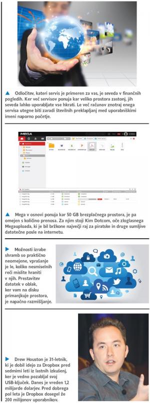 O tem, zakaj uporabljati hranjenje v oblaku, se mora prepričati in izkusiti vsak sam. Si predstavljate, da kjer koli kadar koli potrebujete ali neki Wordov dokument, seznam dostopov do spletnih strani, mapo s fotografijami za obdelavo in tako naprej in da vam tega ni treba prenašati z računalnika na računalnik s ključki in e-pošto? Tisti, ki uporabljajo samo en računalnik, te priložnosti ne bodo doumeli, vsi drugi, ki imamo doma en računalnik, v službi drugega, s seboj pa po možnosti tovorimo še prenosnik, tablico in mobilni telefon, pa oblačne shrambe jemljemo kot sanje.